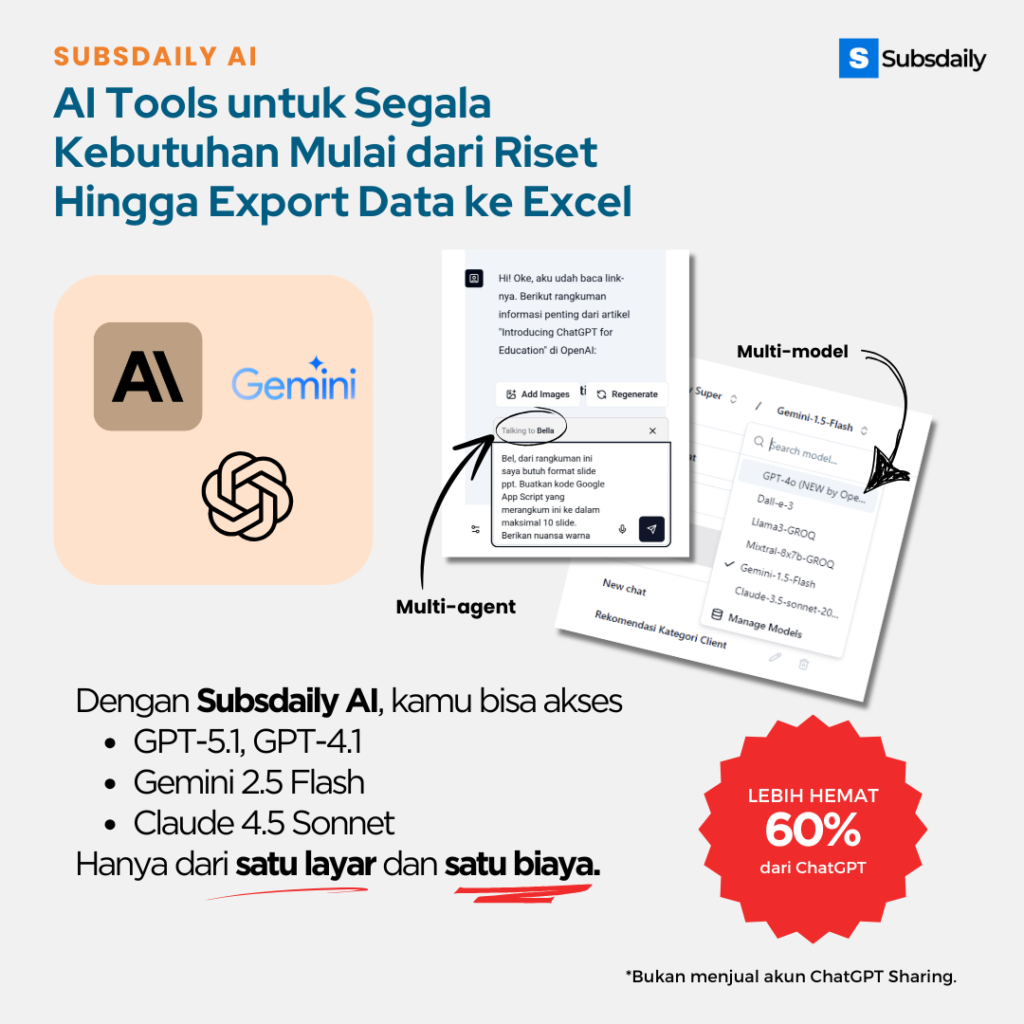 Cukup bayar satu paket untuk akses Model AI pilihan (GPT-5, Gemini-2.0-Flash, Claude 4 Sonnet, dan lainnya).